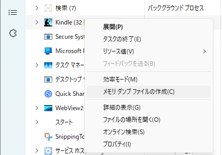 Kindle(32ビット)を右クリックし、「メモリダンプファイルの作成」をクリック
