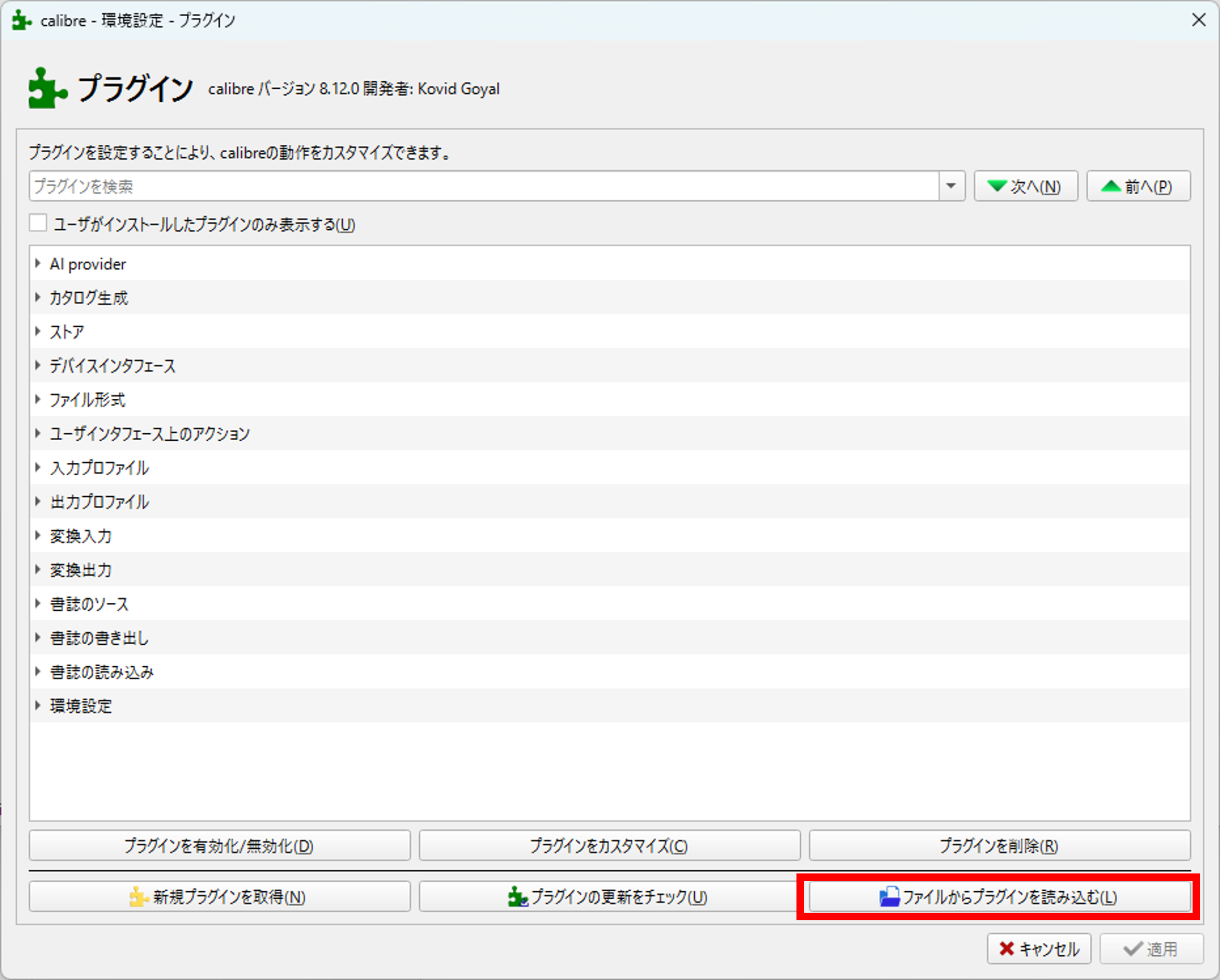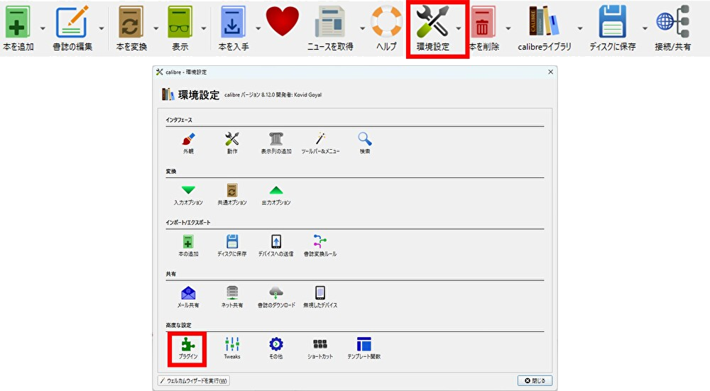 calibreを開き、「環境設定」→「プラグイン」から、