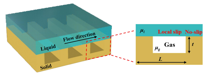 濡れ性が異なる表面をストライプ状に配置した場合、滑り長は流れの向きによって変化する