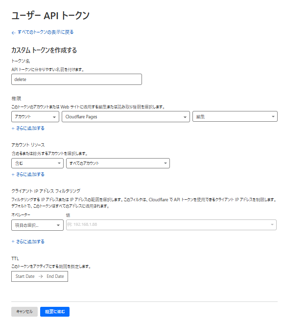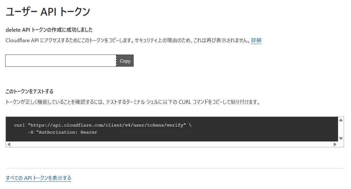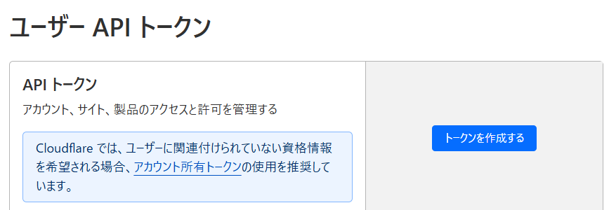 先ほど確認したアカウントIDのすぐ下に"「API トークンの管理」というリンクがあるので、クリック