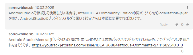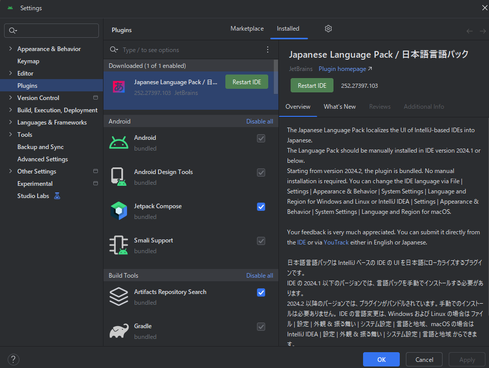2025年版のAndroidStudioではすぐに日本語化プラグインが使えません