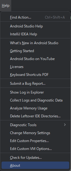 AndroidStudioのHelpのAboutからバージョンを確認して