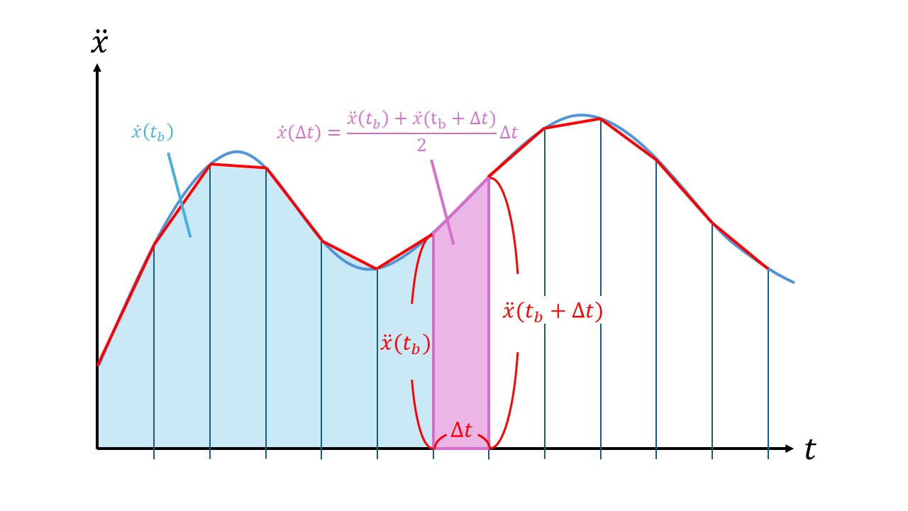速度の増加量$\dot{x}(\Delta t)$は、先の図の$\ddot{x}t$の部分にあたり、加速度曲線における面積は台形の公式($\frac{上底+下底}{2}\cdot高さ$)を使って求められる