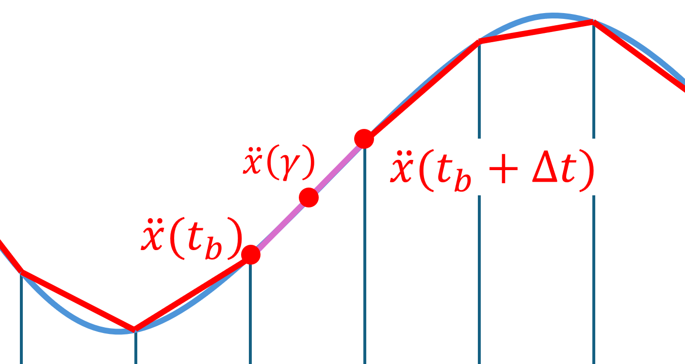 加速度曲線において、$\ddot{x}(t_b)$と$\ddot{x}(t_b+\Delta t)$を内分する$\ddot{x}(\gamma)$を考える