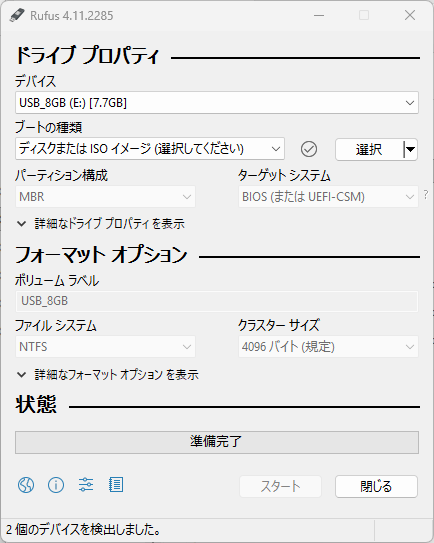 こんな画面が出てきたら、「デバイス」でブートメモリ化したいやつを選択し、「ブートの種類」で右の「選択」からダウンロードしたisoファイルを選ぶ