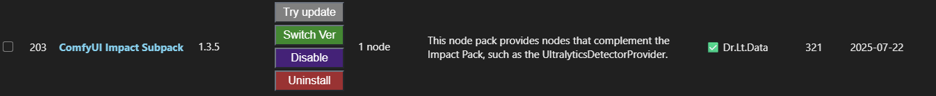 “Manager"メニューから"Custom Nodes Manager"を開いて、ComfyUI Impact PackとComfyUI Impact Subpackをインストール