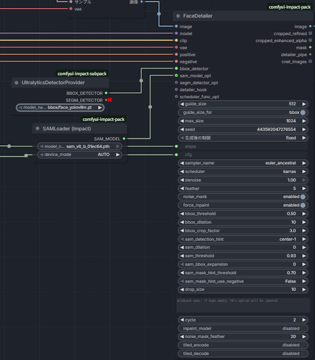 追加するのはFaceDetailerとUltralyticsDetectorProviderとSAMLoaderの3つ